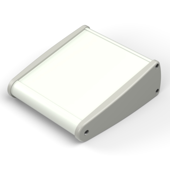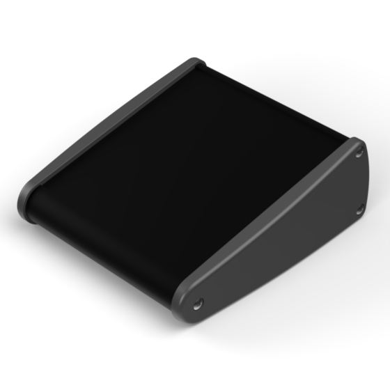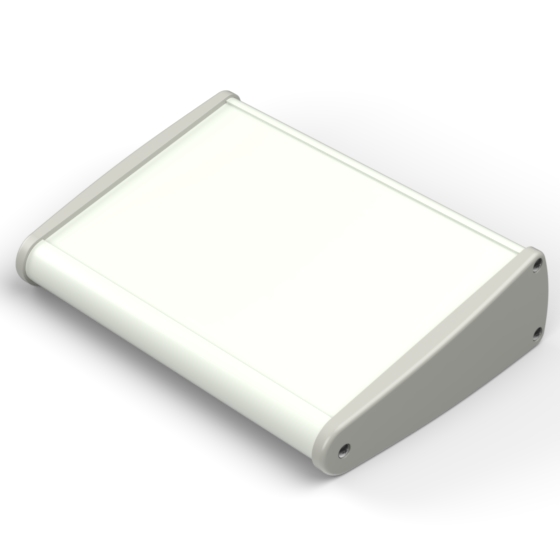 Inclined extruded aluminium case with high quality painted finishing. Two ABS side panels, internal guides for PCB, recessed area for membrane keypad.Closing by six screws. Two colours combinations: black RAL 9004 / grey RAL 7012 - white RAL 9002 / light grey RAL 9018. Upon request wall-suspension element “MT7.0”.