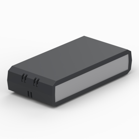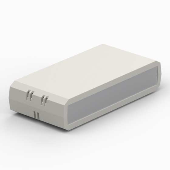 ABS enclosures with aereation slots. Front and rear 1 mm painted aluminium panels. Base and cover have PCB mounting studs. Matt surface finish. Snap-together closing, no screws required.