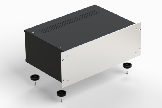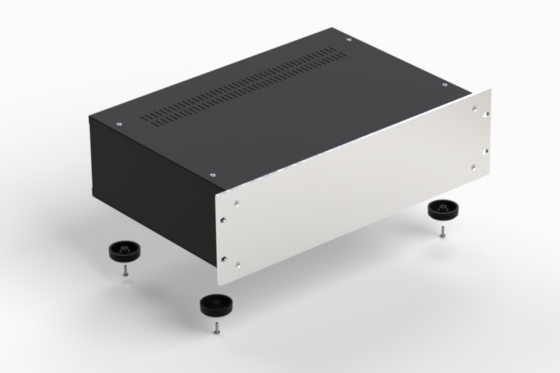 Series of modern styled enclosures with extremely accurate finish. The front panel is manufactured from silver anodised aluminium, the cover and the side panels from black steel. Ventilated covers. Panels remove easily while leaving the sub-assembly intact. ACCESSORIES: internal base mm. 175 x 435 (Mod. LEVEL) - Flat anodised aluminium handles, silver or black colour (FLAT RACK) - Round handles in black plastified steel (ROUND RACK).