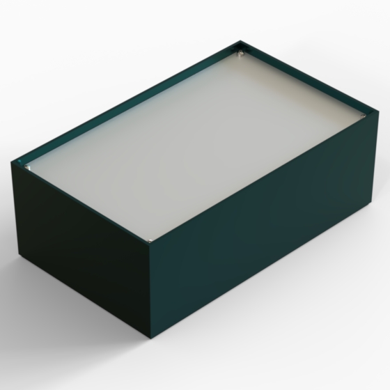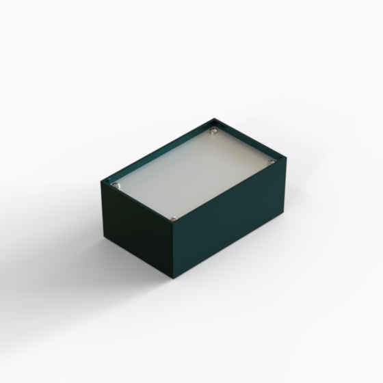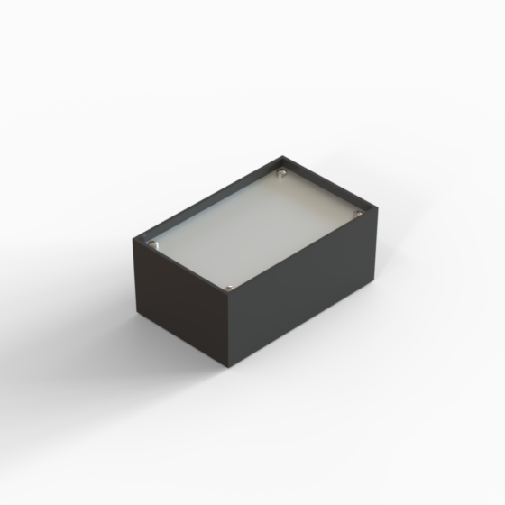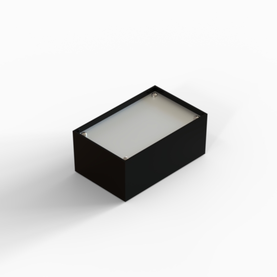 ABS enclosures with square corners and glossy surface finish. The base walls have integral PCB guides. P series have 1 mm aluminium panel.