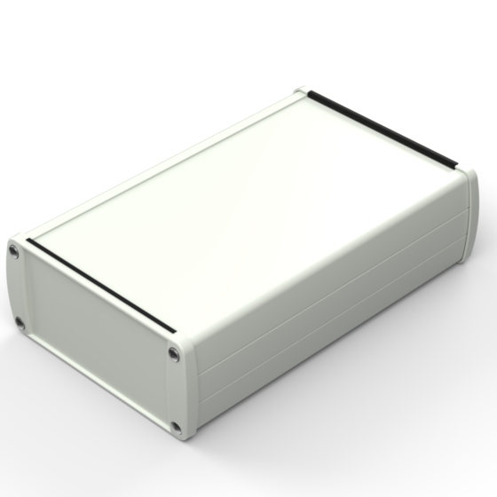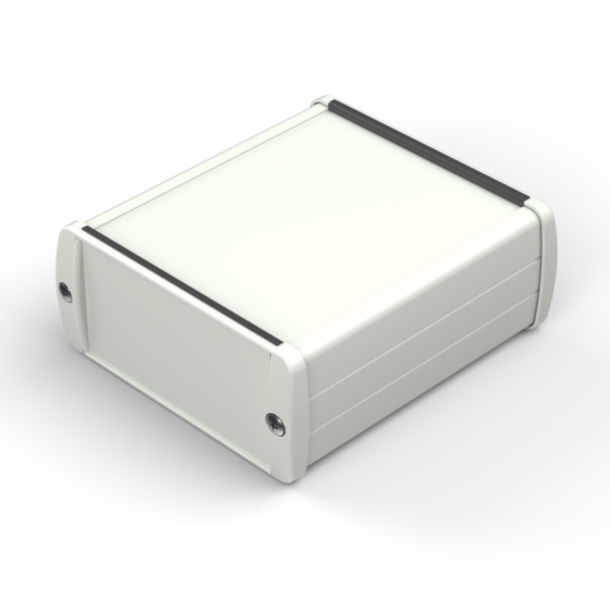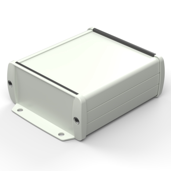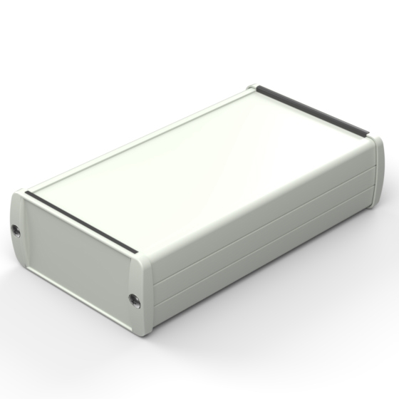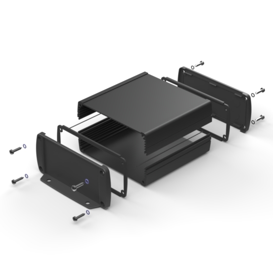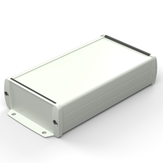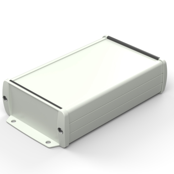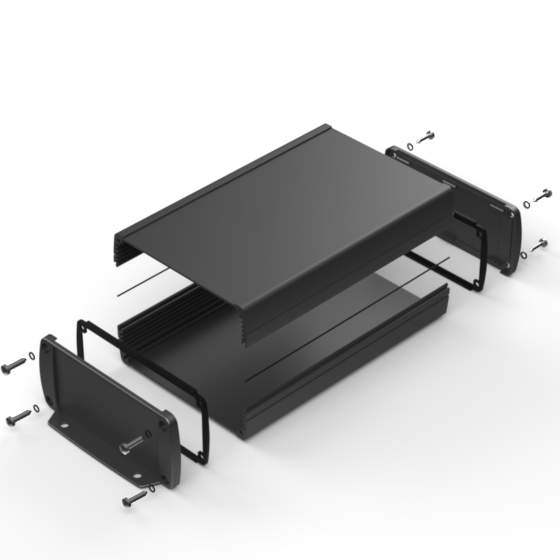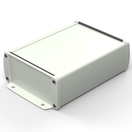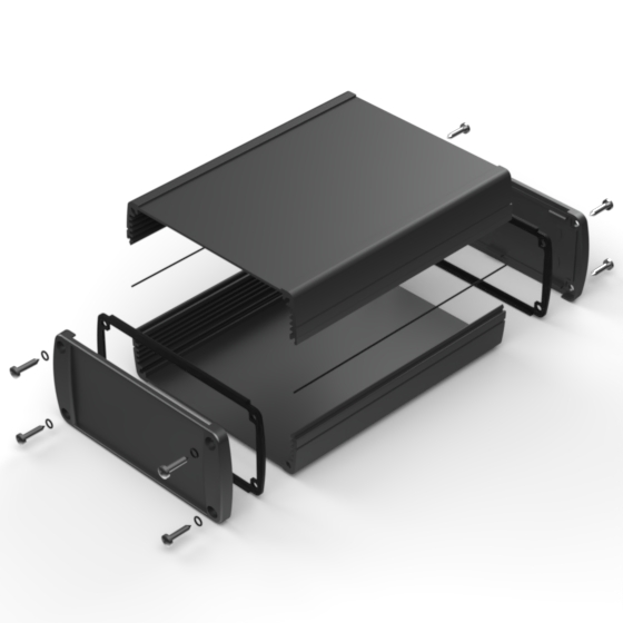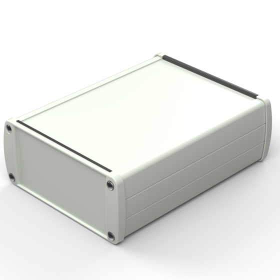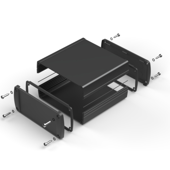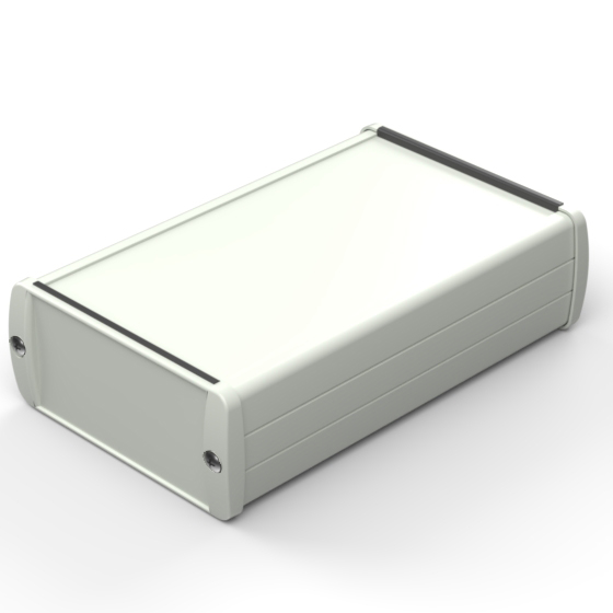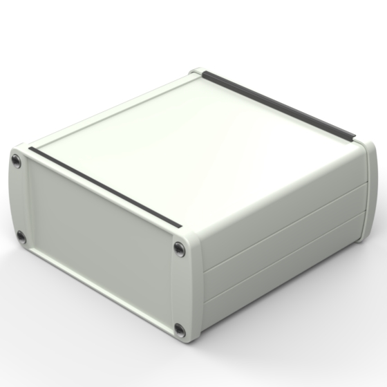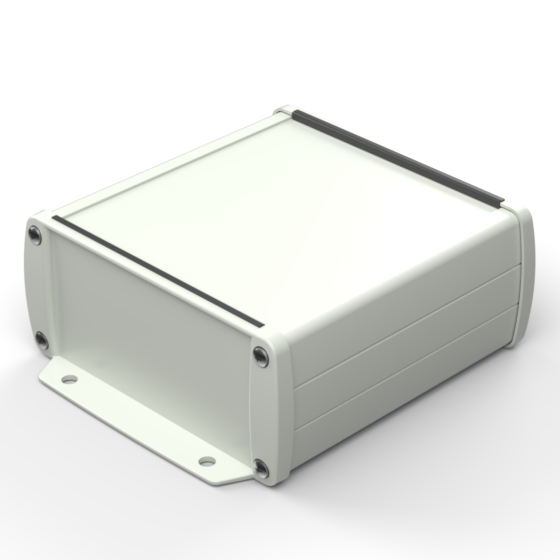 Boîtiers en aluminium extrudé avec revêtement par poudre d’haute qualité, deux couvercles en aluminium munis de jeu de joint pour protection contre l’eau et la poudre (IP65) disponibles an six couleurs différentes, guides internes pour PCB et partie supérieure avec décrochement pur clavier à membrane. Les modèles référencées «-E» sont prévus pour fixation murale. Montage par quatre ou par huit vis.